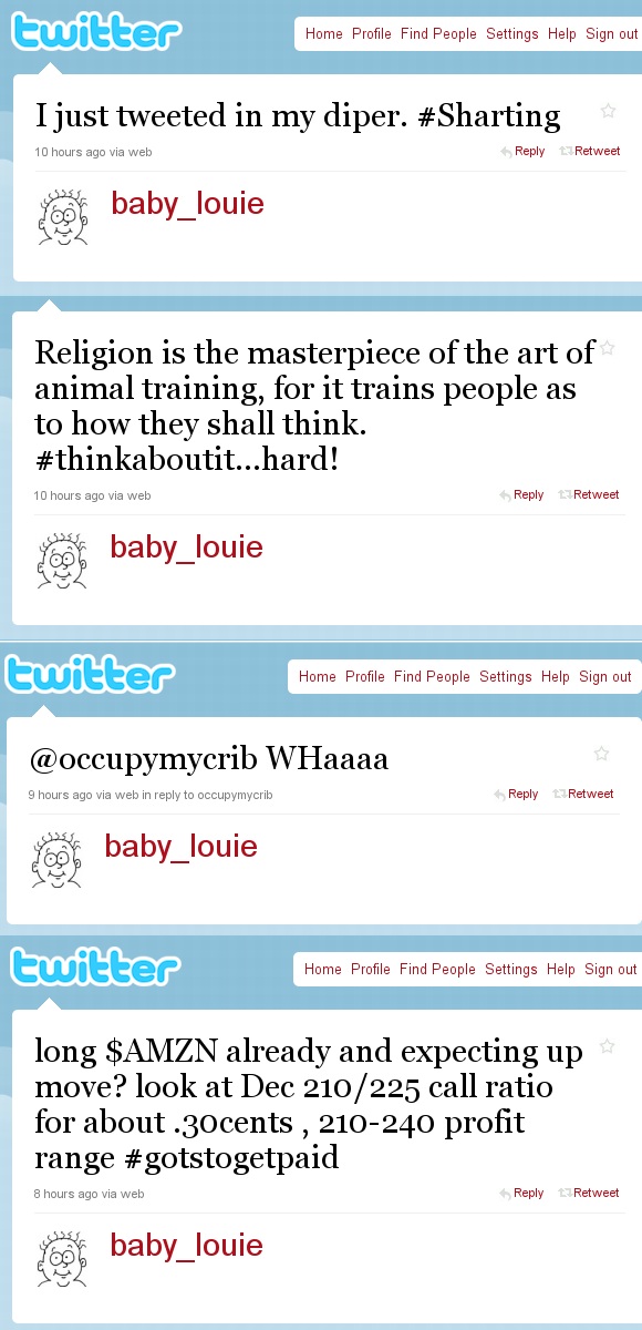 We were curious about what Baby Louie’s twitter feed looks like. With a little hardcore kernel hacking, we found it. Here it is for your enjoyment!