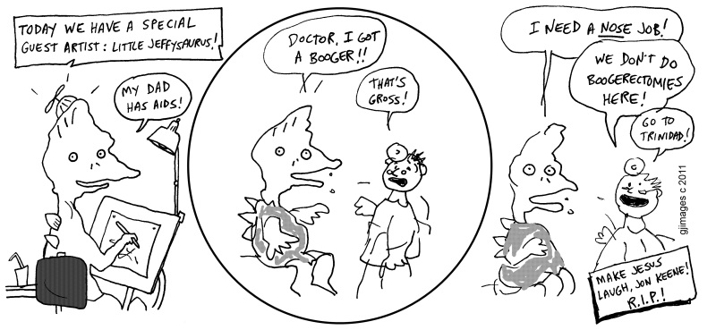 Somehow, I don’t think Jesus (or anyone else) is laughing at Mr. Keene in heaven. Which makes it just like earth for the past 50 years. Maybe the next Jeffysaurus cartoon should be a “Did you come straight to heaven?” question, followed by a circuitous route of cumming on angel whores. “Who skull fucked Anna Nicole Smith on the way to the pearly gates?” NOT ME!