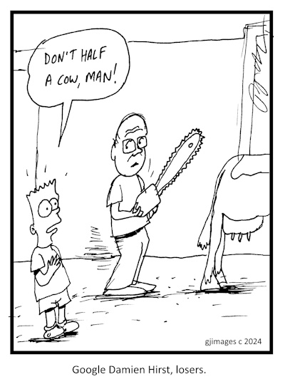 The caption below reads “Google Damien Hirst, losers.” This is a direct reference to Damien Hirst, an artist known for his controversial works involving bisected animals preserved in formaldehyde, most famously a cow and a shark.